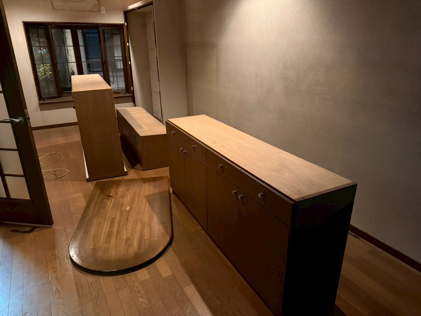 食器棚のみの回収をご希望で、回収後の簡易清掃もあわせて対応しています。運び出しルートを確認し、2名で1時間の作業で完了しました。